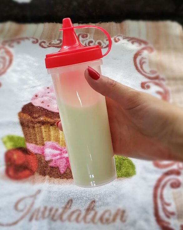 Transfira a calda para uma bisnaga ou regador de bolos, isso facilita na hora de aplicar a calda no bolo.