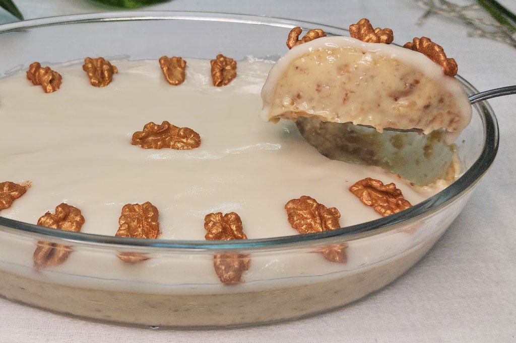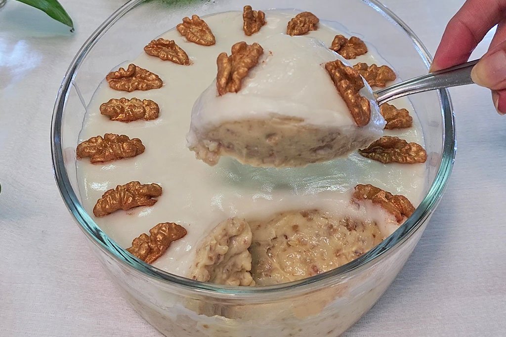 Essa sobremesa de nozes na travessa é sucesso garantido em qualquer mesa. O contraste entre o creme cremoso e a crocância das nozes tostadas cria uma experiência única a cada colherada. Prepare com antecedência, leve à geladeira e sirva geladinha, o sabor fica ainda mais delicioso e a textura irresistível.