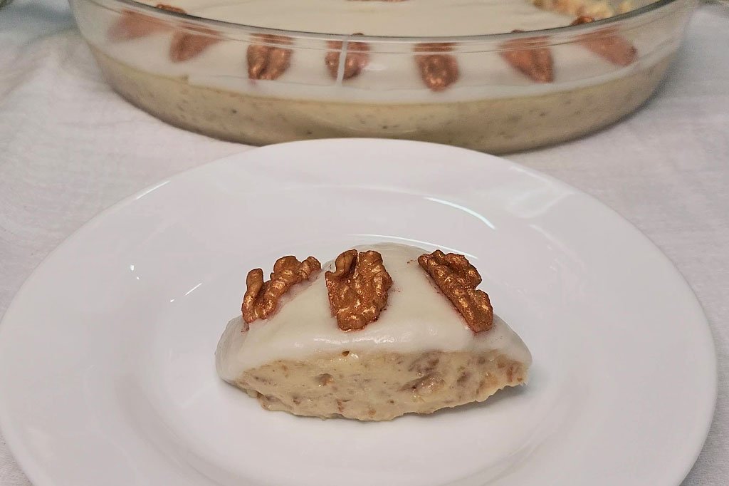 Sim! É até recomendado preparar com um dia de antecedência, pois o sabor e a textura ficam ainda melhores depois de gelar. Apenas adicione a cobertura de açúcar e as nozes douradas no dia de servir, para manter o brilho e a aparência fresquinha.