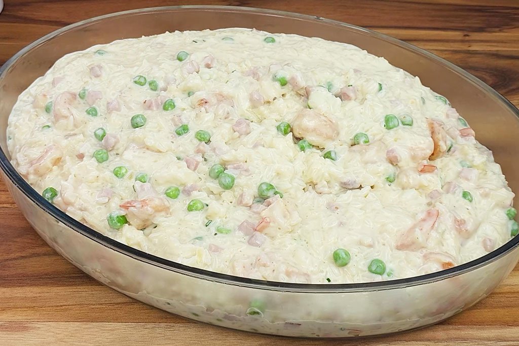 e misture por 1 minuto. Acrescente 1 xícara (chá) de ervilha congelada, depois 600 g de creme de leite, e misture bem. Em seguida, junte 250 g de requeijão cremoso e 200 g de queijo muçarela, mexendo até derreter. Adicione 4 xícaras (chá) de arroz cozido ao molho cremoso, misture cuidadosamente e ajuste o sal, considerando que o presunto, queijo e requeijão já têm sal. Acrescente o cheiro-verde a gosto e os camarões grelhados. Misture delicadamente. Transfira a mistura para uma travessa resistente ao forno (aproximadamente 35 x 24 cm). Espalhe bem e cubra com 200 g de queijo muçarela. Leve ao forno pré-aquecido a 250°C para gratinar rapidamente. Use grill, se disponível, para dourar sem ressecar o camarão. Decore com cheiro-verde e 80g de batata palha ao redor para crocância. Sirva imediatamente, bem quente, cremoso e saboroso.