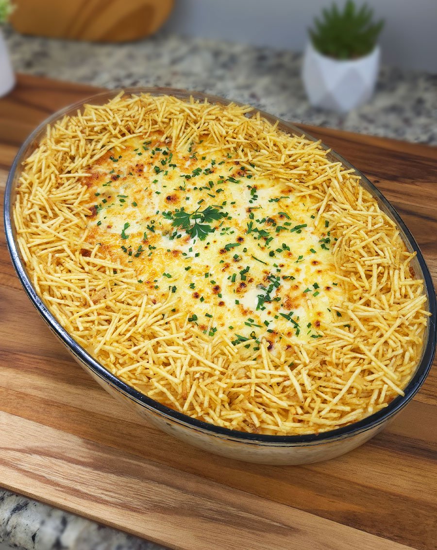 - Decore com cheiro-verde e batata palha ao redor para crocância. Sirva imediatamente, bem quente, cremoso e saboroso.