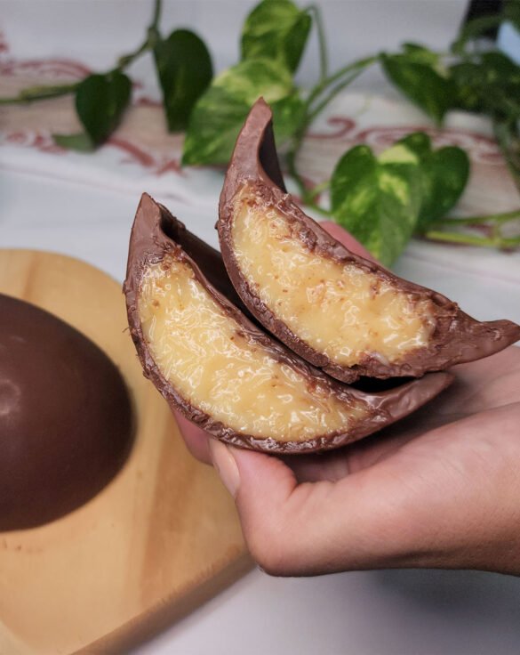 Para evitar que a casca quebre, é importante não ultrapassar a espessura ideal. A casca deve ser bem distribuída dentro da forma e refrigerada por tempo suficiente até que ela fique completamente firme. Além disso, ao desenformar o ovo, faça isso com delicadeza para não forçar a casca.