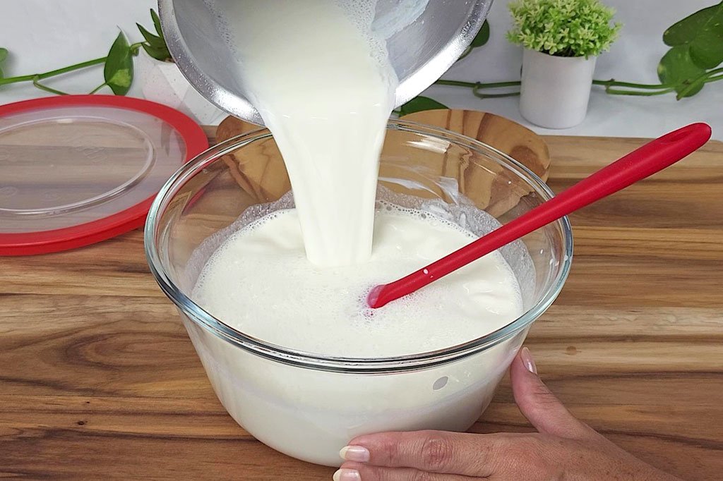 - Coloque o iogurte natural em um recipiente de vidro ou cerâmica. e adicione um pouco do leite morno e misture bem para igualar as temperaturas (temperagem).