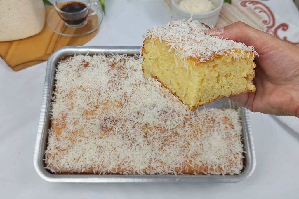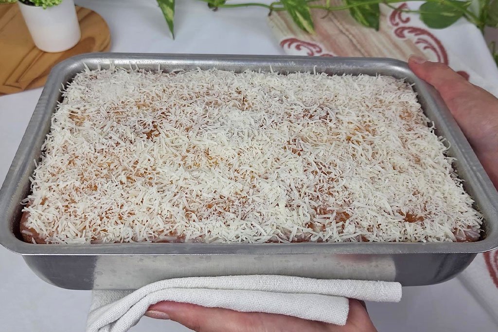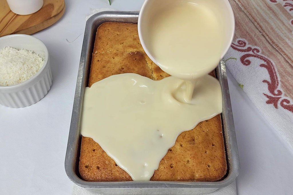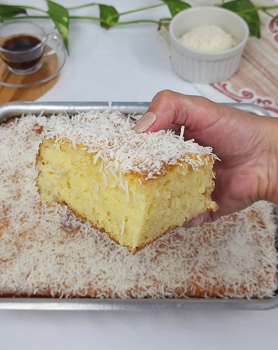 - Finalize com coco ralado e deixe o bolo absorver a caldinha por alguns minutos antes de servir.