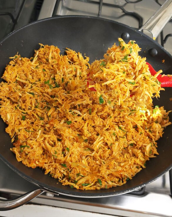 - Misture bem, pressionando o frango nos temperos para incorporar o sabor enquanto refoga.