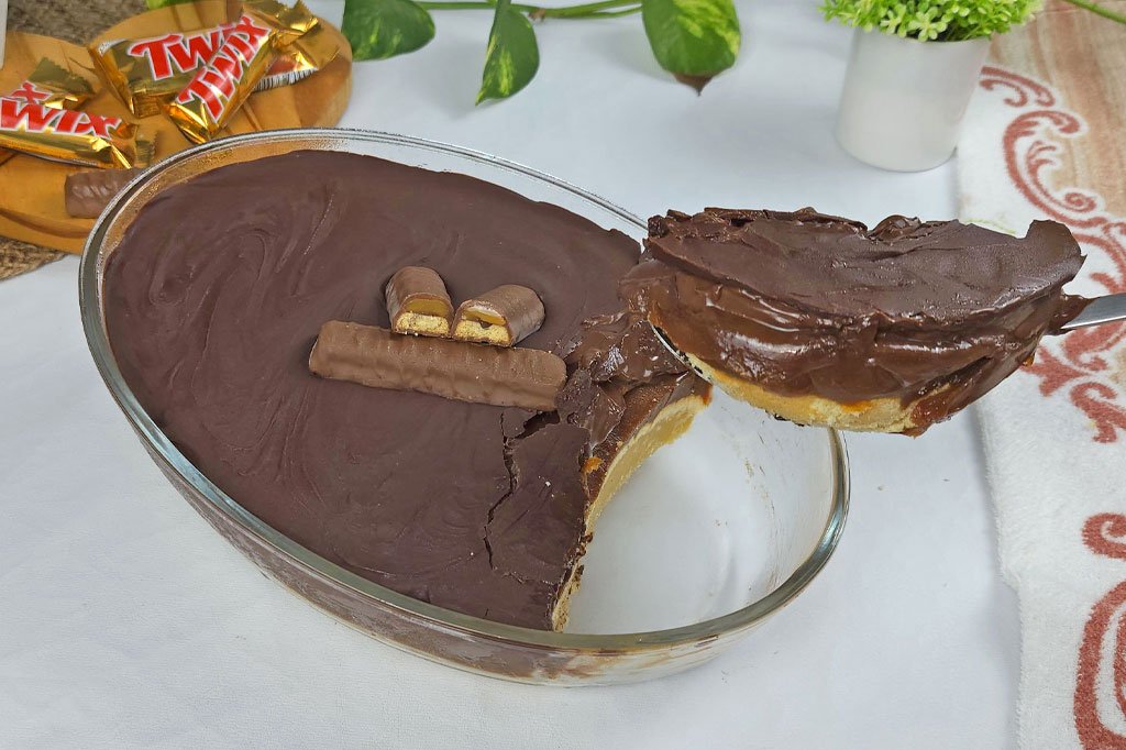 Sobremesa Twix de Travessa: Caramelo, Chocolate e Massa Crocante