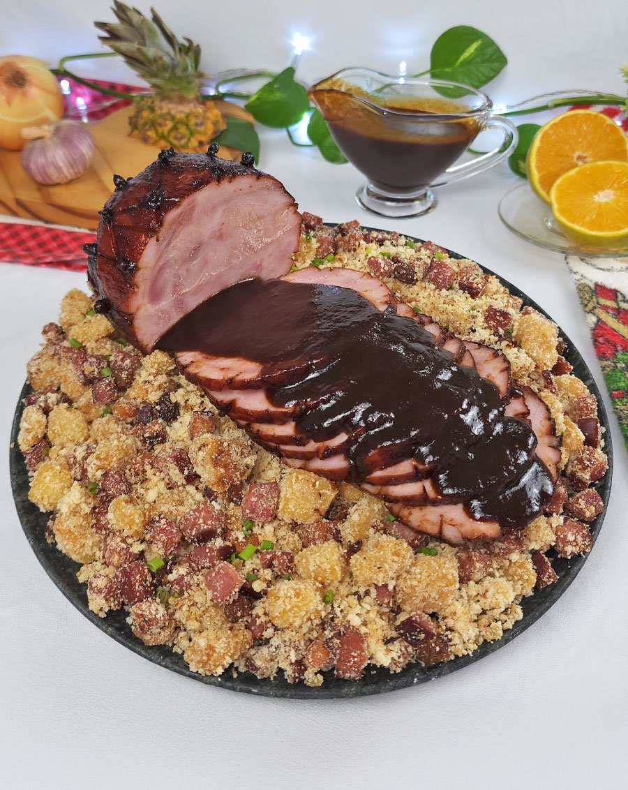 ▪️Pincele o molho várias vezes, especialmente na etapa final. Isso realça o sabor, melhora a cor e deixa o tender com aparência ainda mais apetecível.▪️O cravo-da-índia é opcional, mas faz diferença no aroma e na apresentação, deixando o tender com cara de prato natalino clássico. ▪️Deixe o tender descansar por alguns minutos antes de fatiar. Isso ajuda a manter os sucos da carne e facilita o corte. ▪️Sirva o molho barbecue quente, despejando um pouco sobre as fatias e deixando o restante à parte para quem quiser repetir. ▪️Capriche na apresentação: uma travessa bonita e acompanhamentos coloridos, como farofa de abacaxi ou frutas grelhadas, valorizam ainda mais o prato.▪️Validade: até 3 dias armazenado na geladeira bem acondicionado em recipiente fechado com tampa ou embalado corretamente para evitar contato com o ar. Nunca deixe o tender pronto fora da geladeira por mais de 2 horas após o preparo, especialmente em dias quentes.